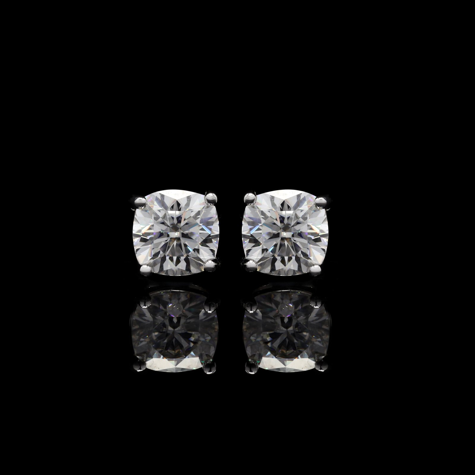 Each earring features a 1.0ct cushion-cut moissanite, totaling 2.0ct of exceptional sparkle. The stones are expertly set in a refined four-prong white gold–plated setting, enhancing the moissanite’s fire and clarity from every angle. Their soft square silhouette combines classic beauty with modern sophistication, making them a perfect complement to any look.