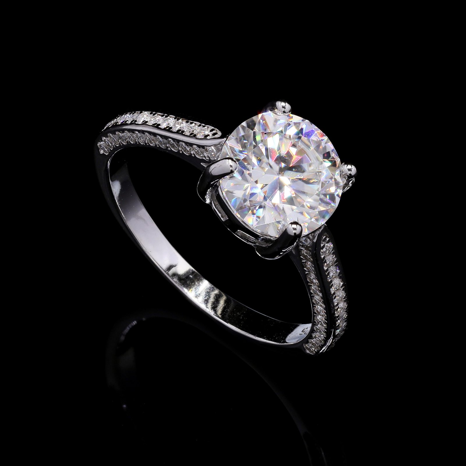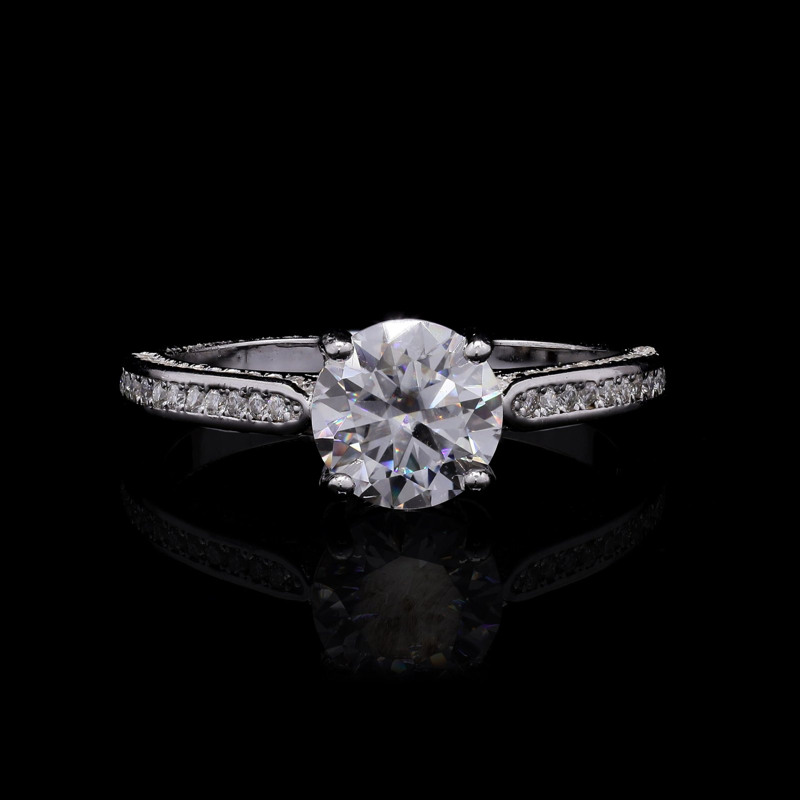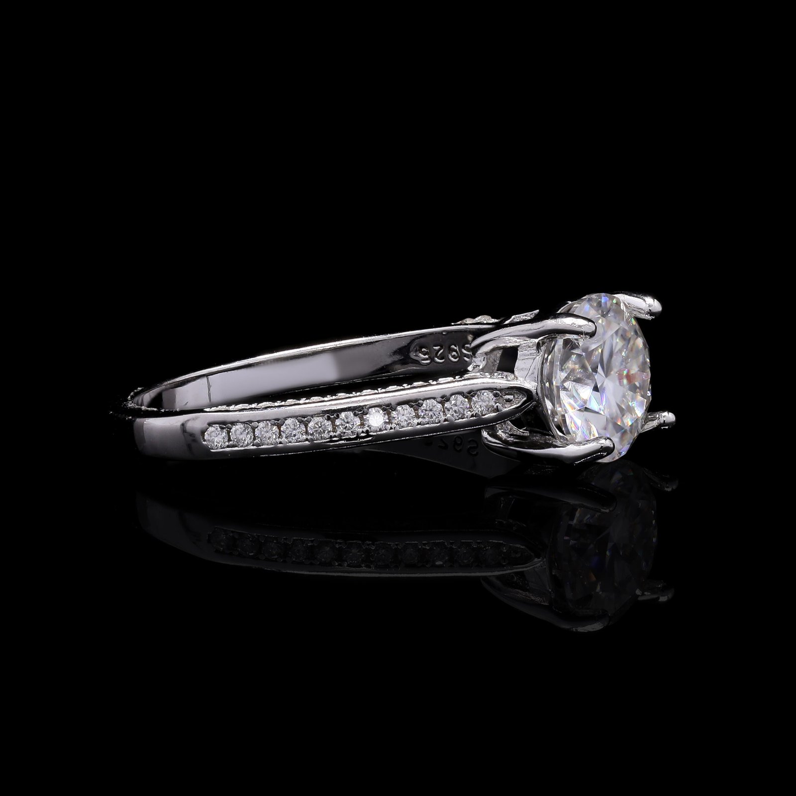 This elegant piece features a 1,25ct round-cut moissanite as its dazzling centerpiece, radiating exceptional fire and clarity. The split pavé band, adorned with 0.35ct of round-cut moissanites, adds a refined shimmer that beautifully frames the central stone. Crafted in high-polish white gold plating, this ring embodies luxury and lasting sophistication.