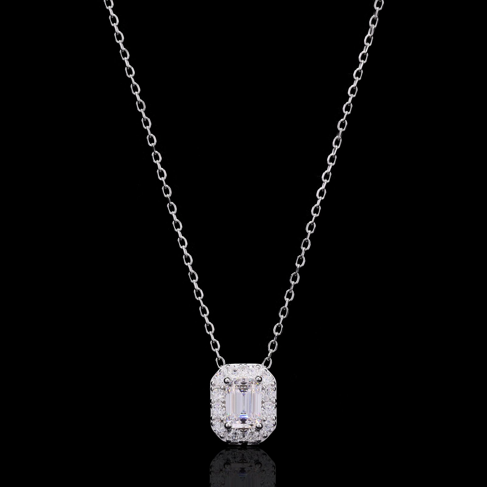 At its center gleams a 1.0ct emerald-cut moissanite, admired for its elegant symmetry and mirror-like brilliance. Surrounding it, a double halo of 0.4ct pavé-set round moissanites enhances its luminosity, creating a captivating display of light and dimension. The pendant’s refined teardrop bail, also encrusted with moissanites, adds an extra touch of sparkle. Finished in polished white gold plating, this piece epitomizes modern glamour and classic grace.