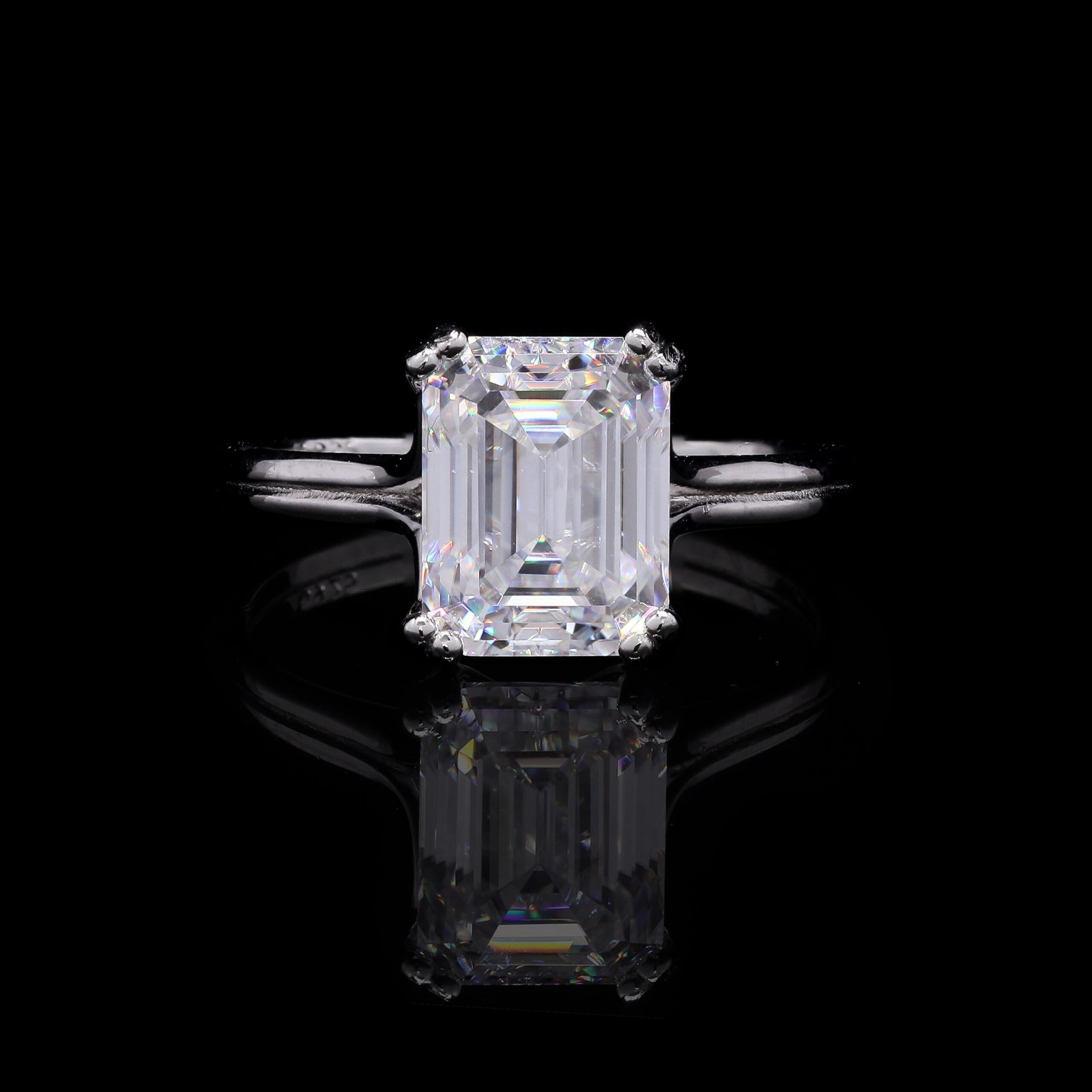 At its center, a breathtaking 3.0ct emerald-cut moissanite takes the spotlight, showcasing mesmerizing clarity and mirror-like brilliance. The minimalist four-prong setting and polished white gold–plated band allow the stone’s natural radiance to shine without distraction, making it an enduring symbol of grace and strength.